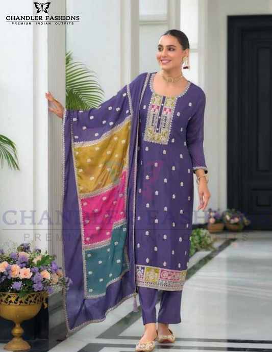 Charming Violet Color Chinon With Embroidery Work With Salwar Suits For Women