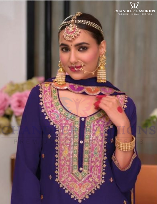 Beautiful Purple Color Chinon Embroidery Work Palazzo Suits With Dupatta