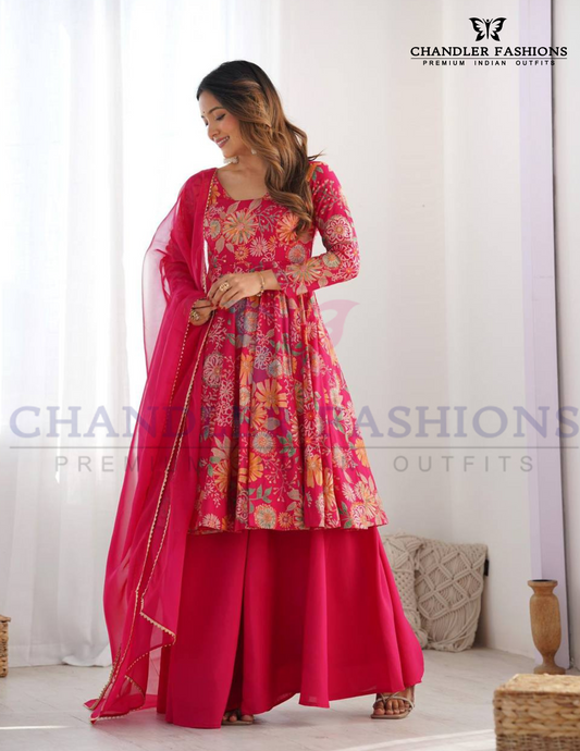 Attractive Rani Pink Color Chinon With Digital Print And Embroidery Work Palazzo Suits For Women
