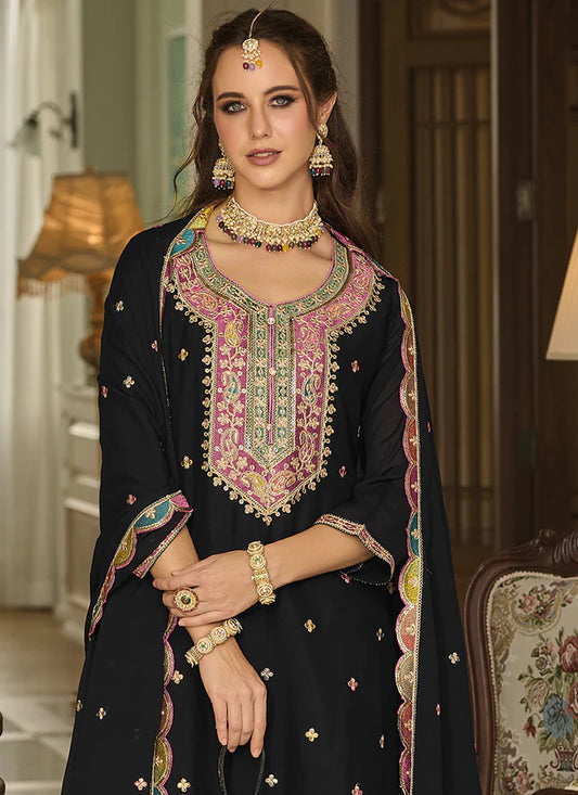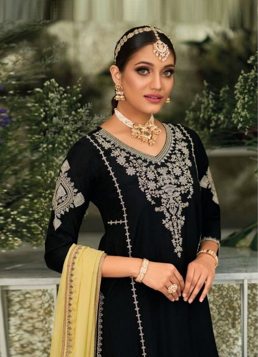 Attractive Black Colored Heavy Chinon With Embroidery Work Palazzo Suits For Womeni