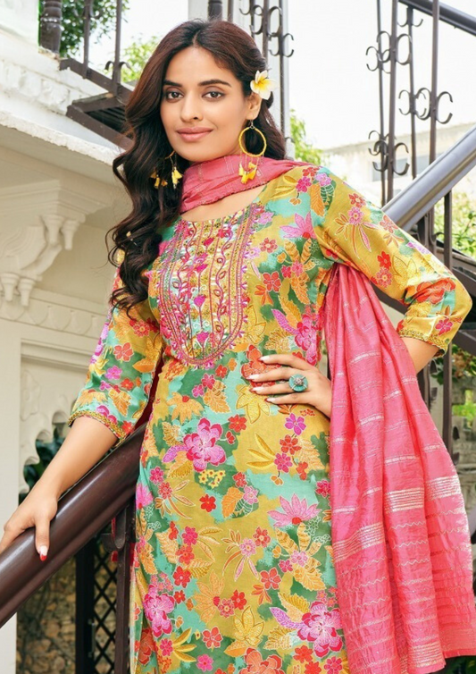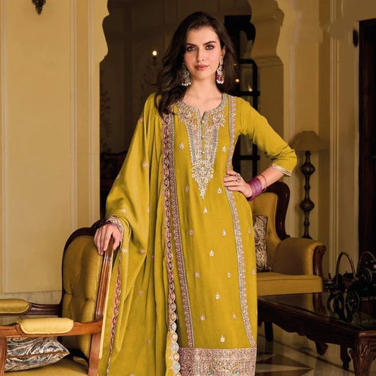 Wonderful Mustard Yellow Colored Pure Silk Heavy Chinon Embroidery Work Salwar Suits