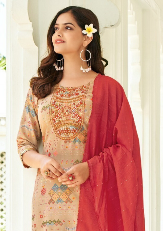 Gorgeous Peach Color Straight Kurti With Pant And Fancy Jacquard Dupatta For Women