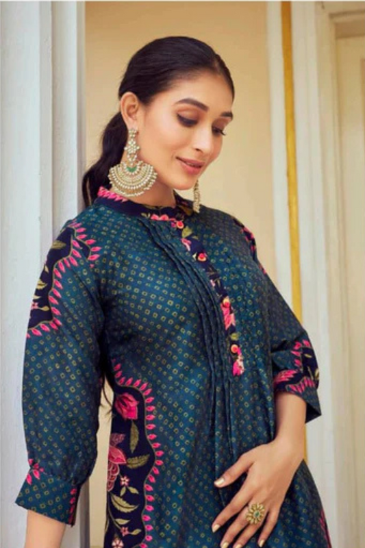 Attractive Dark Blue Colored Tusser Silk With Floral Design Indo Western Kurti And Suits