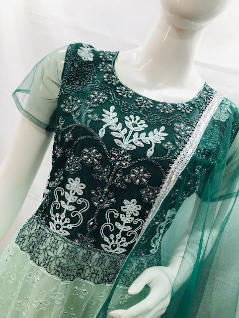 Attractive Green Colored Full Net Embroidery And Sequins Work Kurti With Dupatta Sets