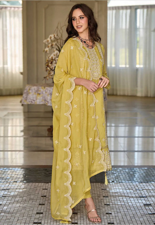 Attractive Yellow Color Soft Organza Salwar Suits For Women