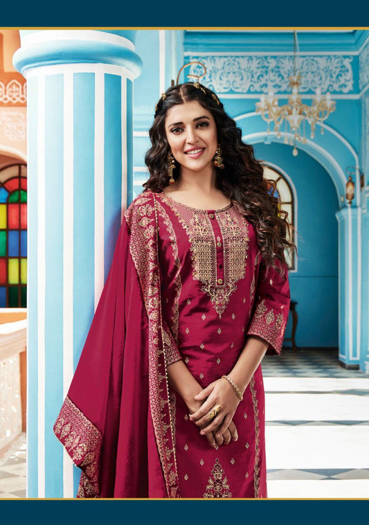 Appealing Pink Colored Pure Dola Silk Jacquard With Hand Work Salwar Suits For Women