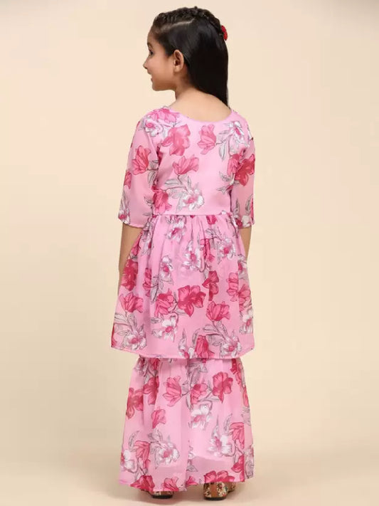Appealing Pink Color Rayon Lace Border Work Sharara Suits For Girls