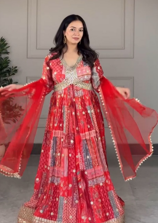 Attractive Red Color Embroidery Sequins Work Aliya Cut Gown, Pant & Dupatta Set