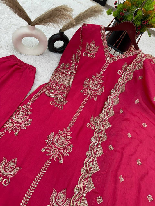Attractive Pink Colored Pure Chinon Heavy Embroidery And Sequins Work Palazzo Suits For Women