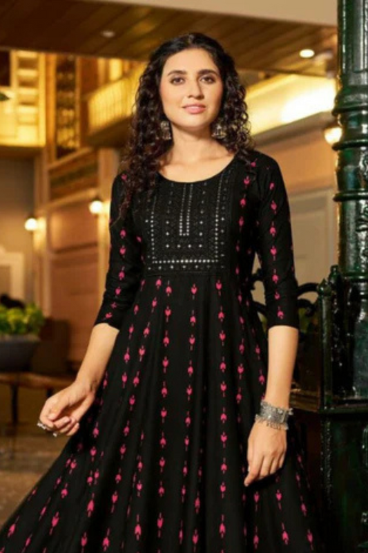Alluring Black Colored Rayon With Neck Embroidery Work Kurti For Women