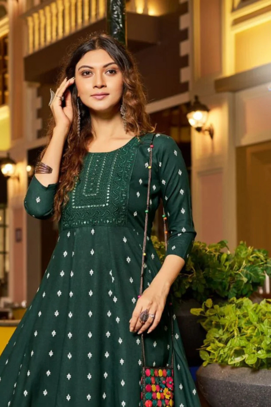 Elegant Dark Green Colored Embroidery Work With Silk Cotton Kurti Suit For Women