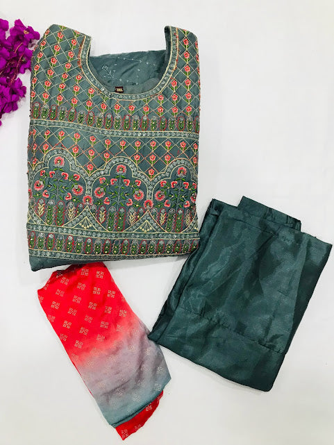 Attractive Gray Color Fancy Embroidery Work Kurti & Pant With Dupatta