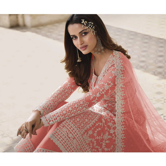 Beautiful Peach Colored Embroidered Net Palazzo Suit