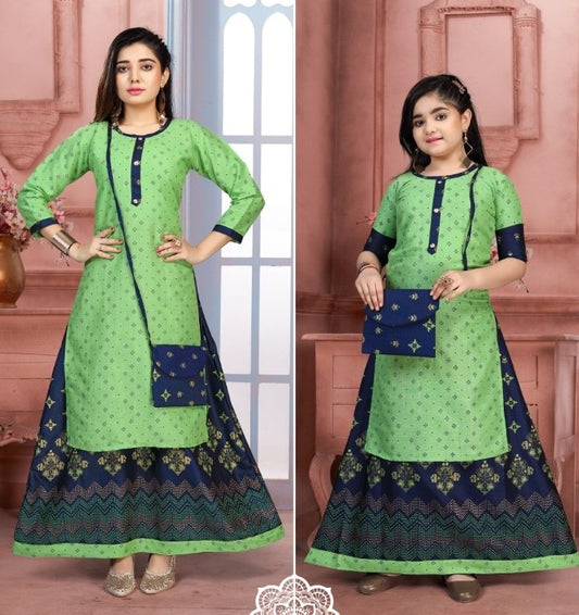 Like Mom Like Daughter Green Stylish Printed Rayon Kurti With Skirt & Purse