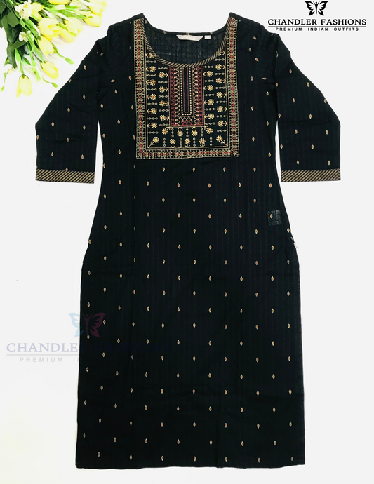 Alluring Black Color Cotton Kurti With Embroidary Work For Women