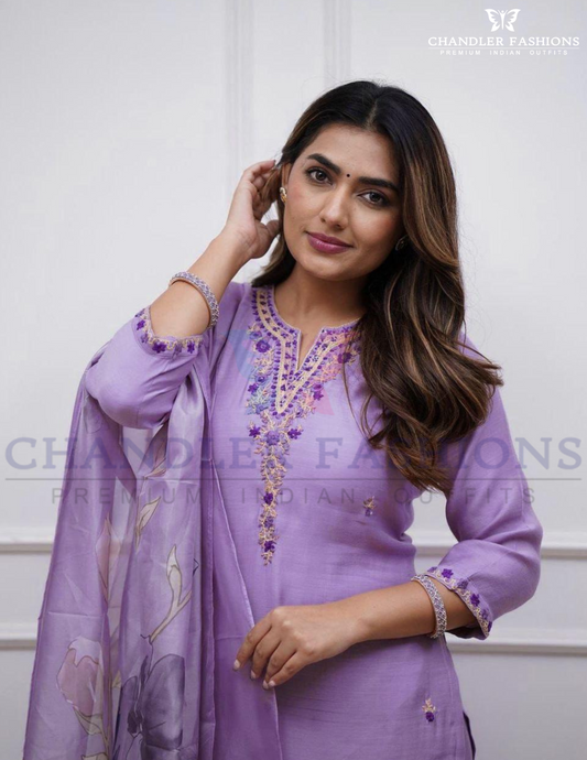 Pretty Lavender Color Pure Chinon Silk With Heavy Embroidery Work Palazzo Suits