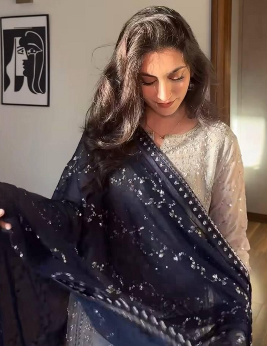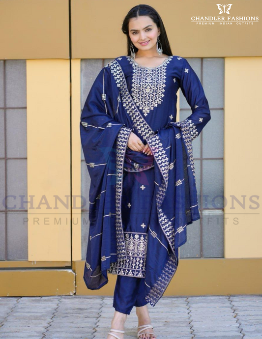 Charming Navy Blue Color Chinon Sequins and Embroidery Work Salwar Suits With Dupatta
