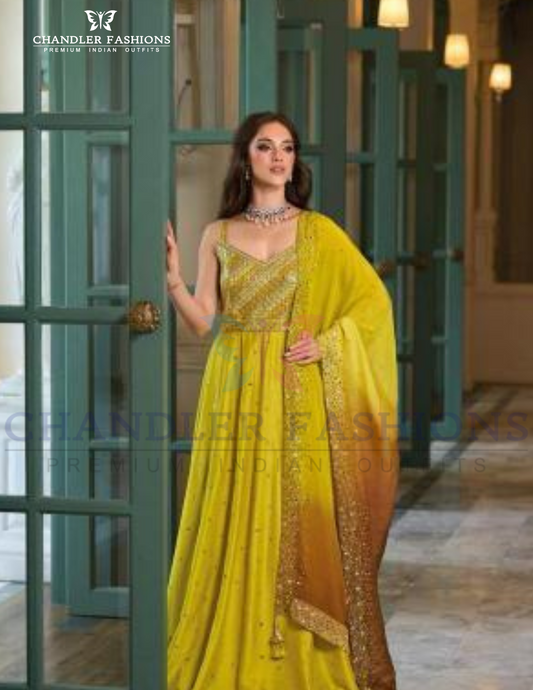 Alluring Lime Green Color Chinon Silk With Embroidery Work Salwar Suits With Dupatta Set