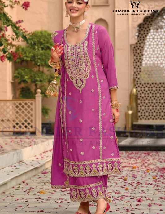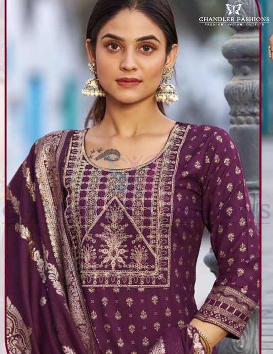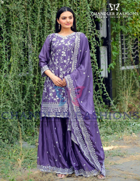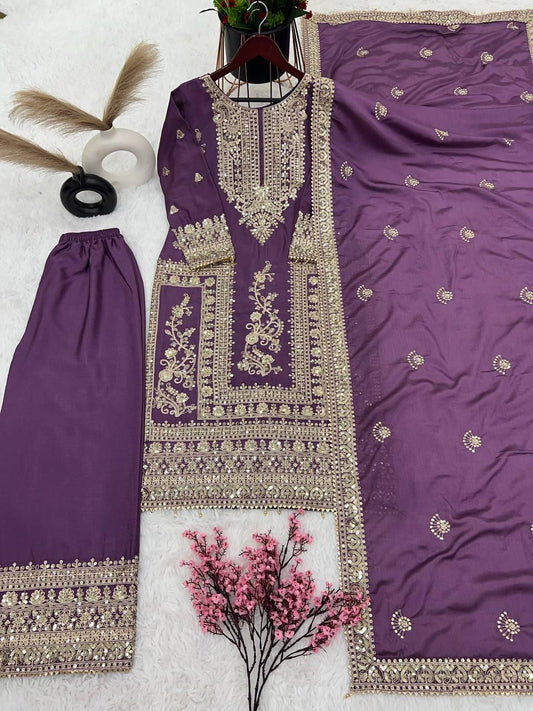 Charming Violet Color Chinon Embroidery And Sequins Work With Palazzo Suits