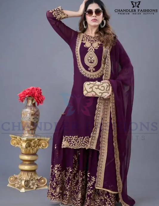 Wonderful Purple Color Faux Georgette Sharara Suit With Heavy Embroidery Sequins Thread Work For Women
