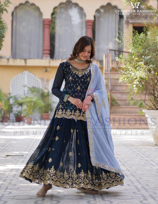 Pretty Teal Blue Color Faux Blooming With Embroidery And Sequins Work Palazzo Suits