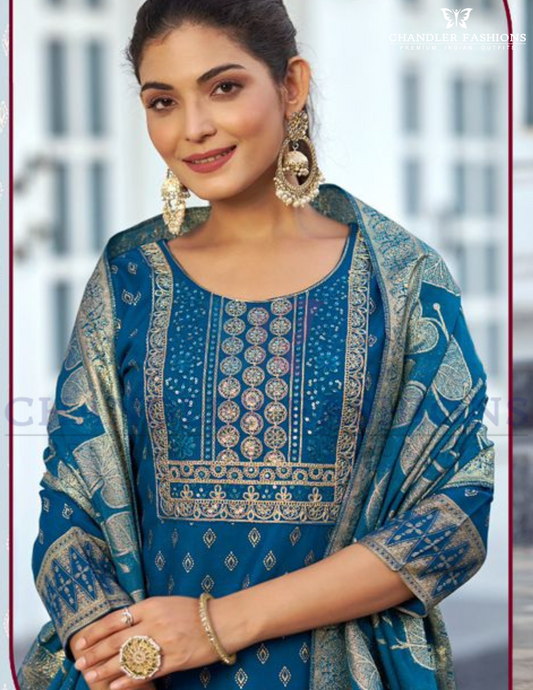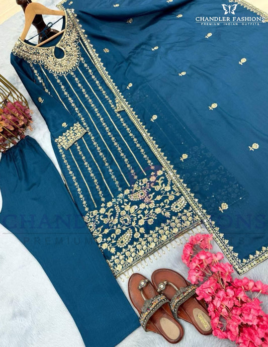 Attractive Teal Blue Color Chinon Silk With Heavy Sequins And Embroidery Work Salwar Suits For Women
