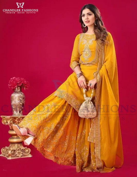 Mustard Yellow Color Faux Georgette With Heavy Embroidery Work Sequins Sharara Suit For Women