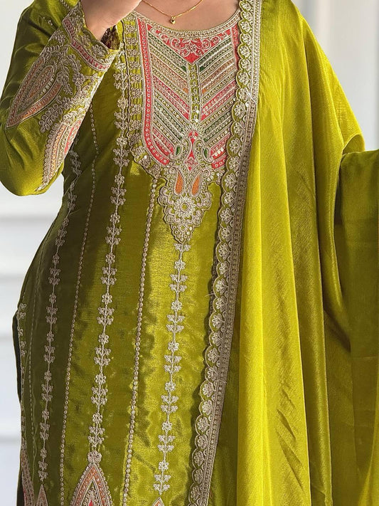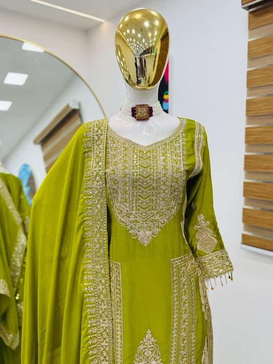 Charming Mehendi Green Color Pure Chinon Silk Salwar Suit With Heavy Embroidery Work