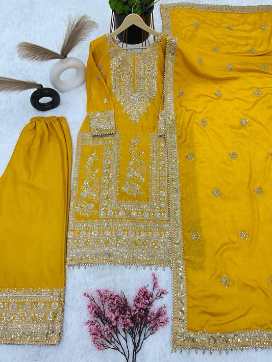 Stunning Yellow Color Pure Chinon Silk Embroidery And Dori Sequins Work Palazzo Suits