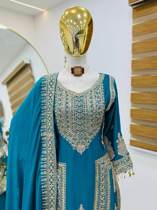 Beautiful Teal Blue Color Faux Georgette Sharara Suit With Heavy Embroidery Sequins Thread Work For Women