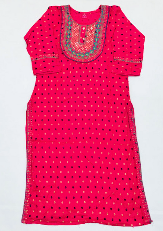 Dazzling Pink Color Embroidery With Printed Work Rayon Kurti