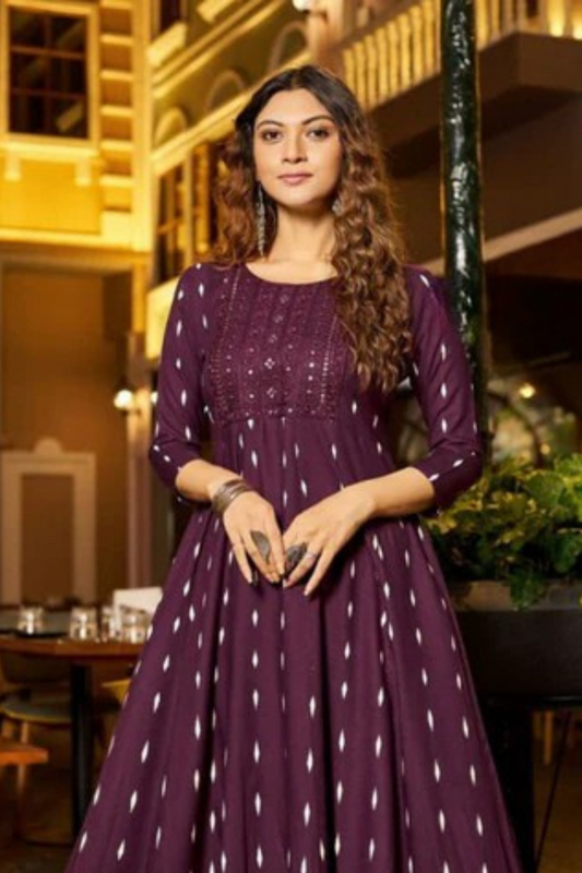 Gorgeous Purple Colored Rayon Foil Print Work Kurti For Women