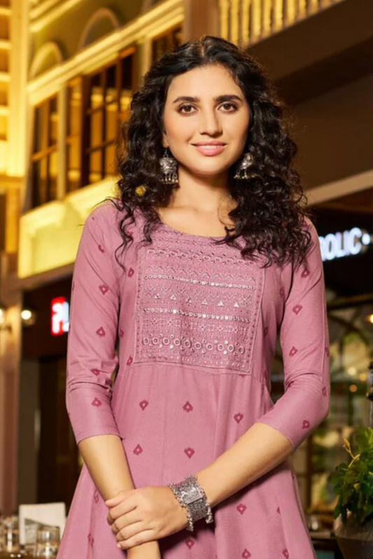 Pretty Pink Colored Heavy Rayon With Foil Prints Kurti For Women