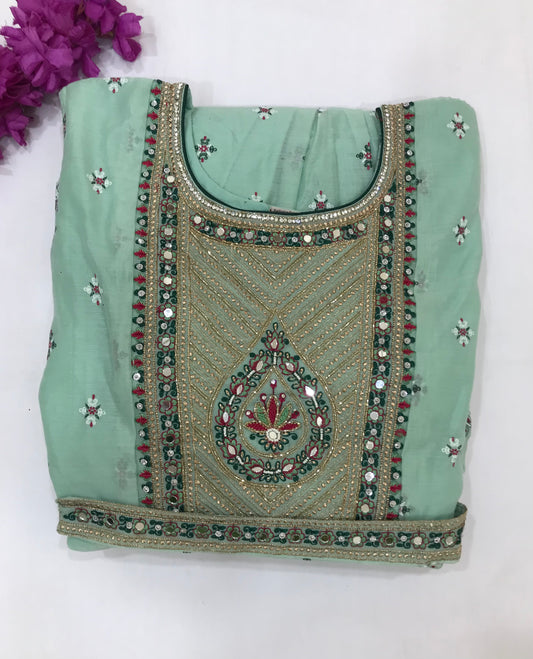 Alluring Light Green Colored Embroidery Work With Silk Cotton Kurti Suit For Women