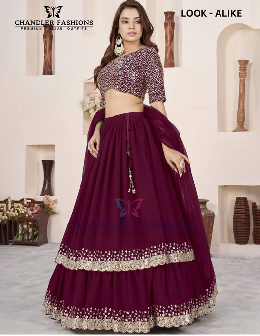 Wonderful Wine Color Georgette With Embroidery And Sequins Work Lehenga For Women