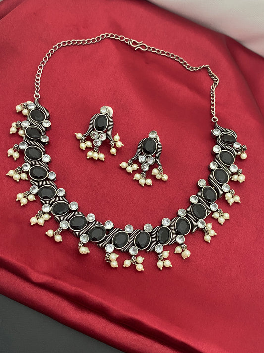 Black Color German Silver Plated Oxidized Short Neckpiece With Matching Earrings And Pearl Drops