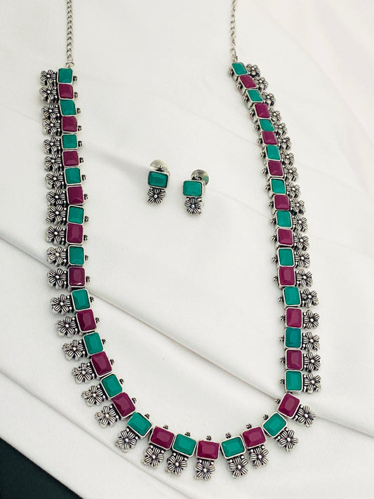 Trendy Multicolor Stone Studded German Silver Plated Antique Finish Oxidized Necklace Set With Earrings