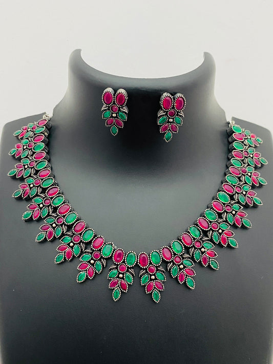 Ravishing Multicolor Stone Beaded Leaf Designed Silver Plated Oxidized Necklace With Earrings