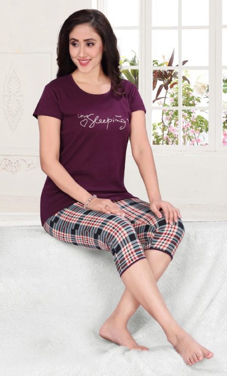 Women's Purple Blush Cotton Top With 3/4th Pant & Full Pant Nightwear 3 Pieces Set
