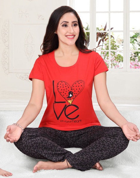 Women's Red Blush Cotton Top With 3/4th Pant & Full Pant Nightwear 3 pieces Set