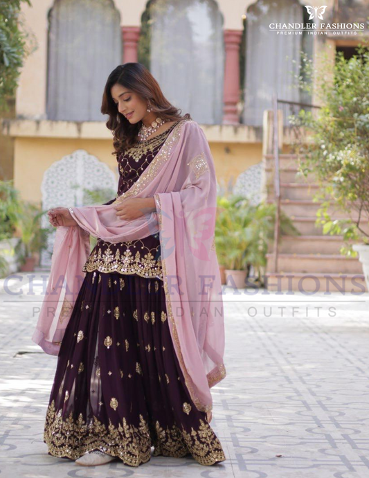 Graceful Dark Purple Color Faux Blooming With Embroidery And Sequins Work Palazzo Suits
