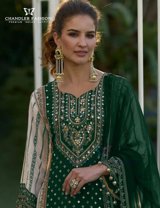 Alluring Green Color Sheer With Printed And Fancy Embroidery Mirror Work Palazzo Suits