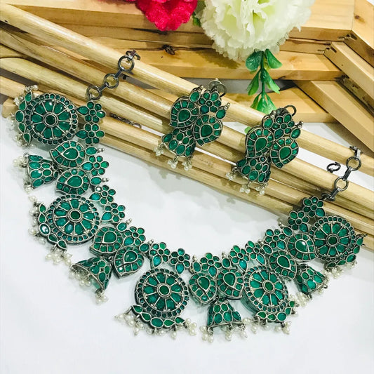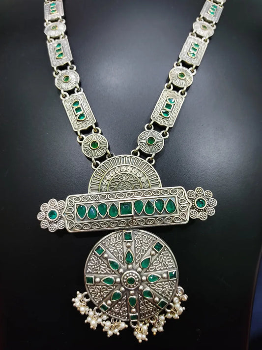 Emerald Stone Oxidized Long Chain And Earrings Made With Brass And Copper