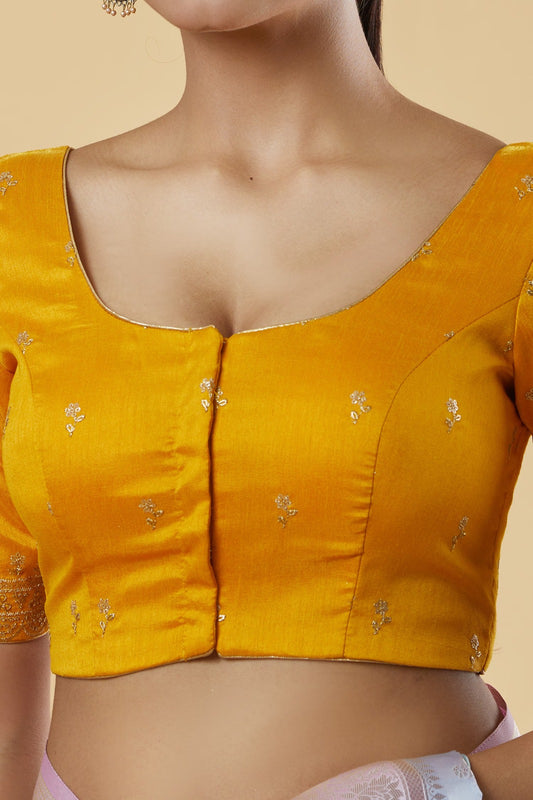 Attractive Front Open Yellow Color Elbow Sleeve Readymade Blouse For Women