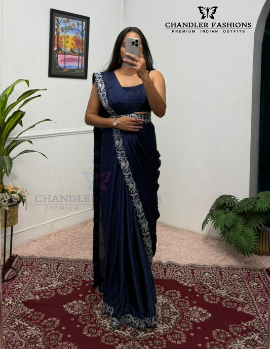 Charming Dark Blue Color Heavy Embroidery Work Ready To Wear Saree For Women