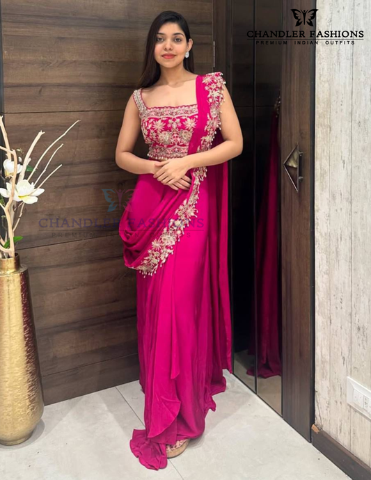 Attractive Dark Pink Color Heavy Embroidery Work Ready To Wear Saree For Women