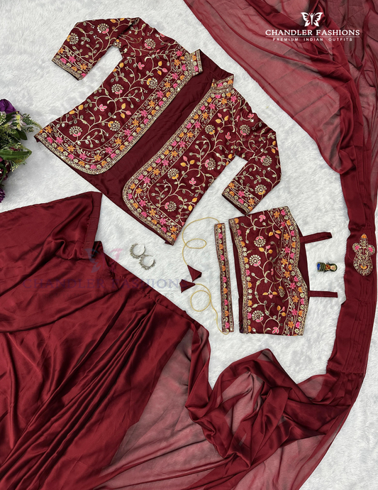 Amazing Wine Color Heavy Embroidery Work Ready To Wear Saree For Women