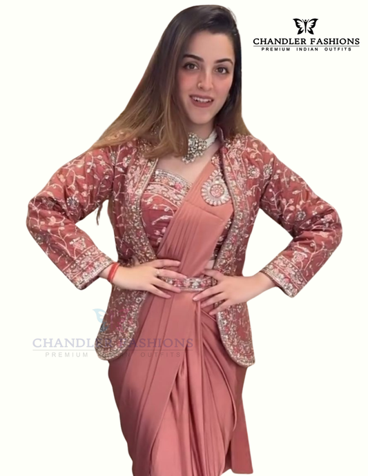 Gorgeous Peach Color Rangoli Fabric Ready To Wear Saree With Embroidered Shrug