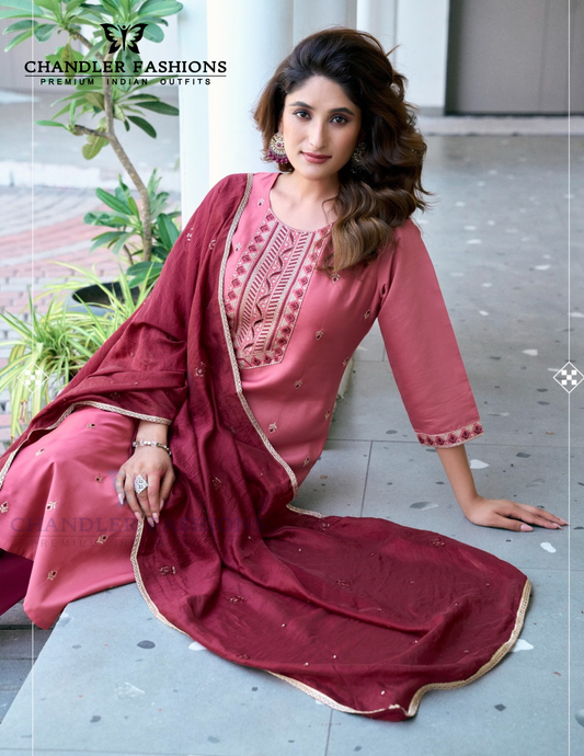 Elegant Pink And Maroon Color Roman Silk Salwar Suits For Women