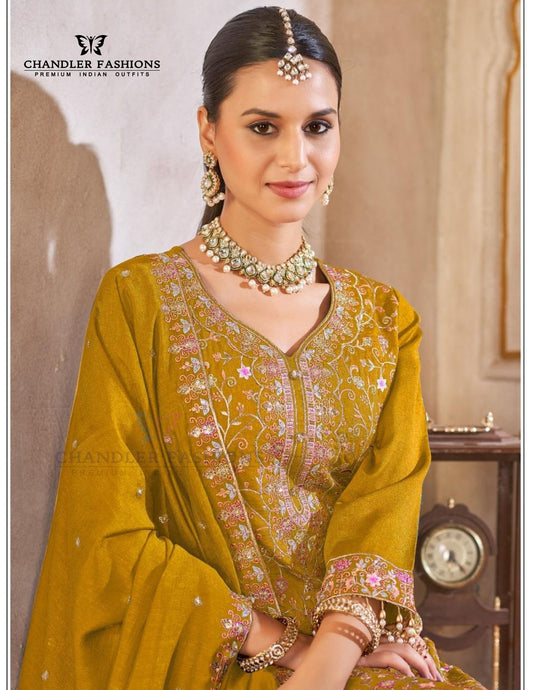 Attractive Mustard Yellow Color Vichitra Silk With Heavy Embroidery Work Salwar Suits For Women